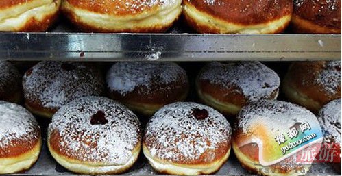 Sufganiyot可以直翻为油炸面团。它比一般的甜甜圈密度较小。糕点上还充满了果冻(或吉士),是犹太人的传统节日光明节食品,也是孩子的最爱。