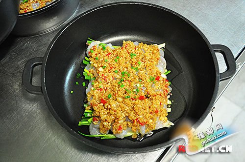 3、虾仁上盖上一层预备好的大蒜末及蒜油,待蒜油浸至锅底,撒上少许葱末,盖上锅盖,完成;