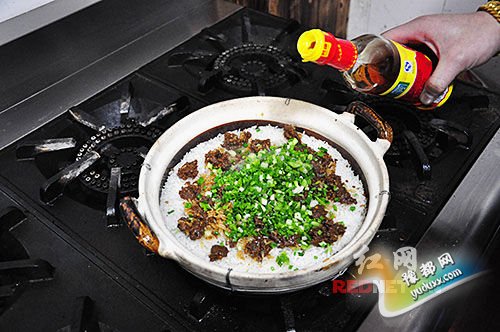 5、盖上盖继续煮6—7分钟至饭熟,揭盖,放葱、香油,焖三分钟。